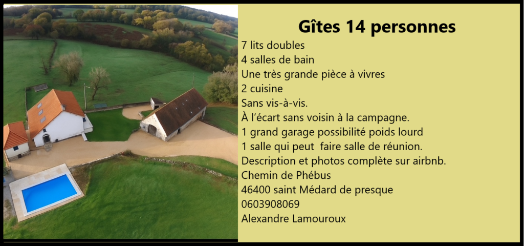 Gites et Chambres d'Hotes Monique GAILLARD 46400 Latouille Lentillac 06-33-80-39-67 g.moniquedu46@live.fr![]()